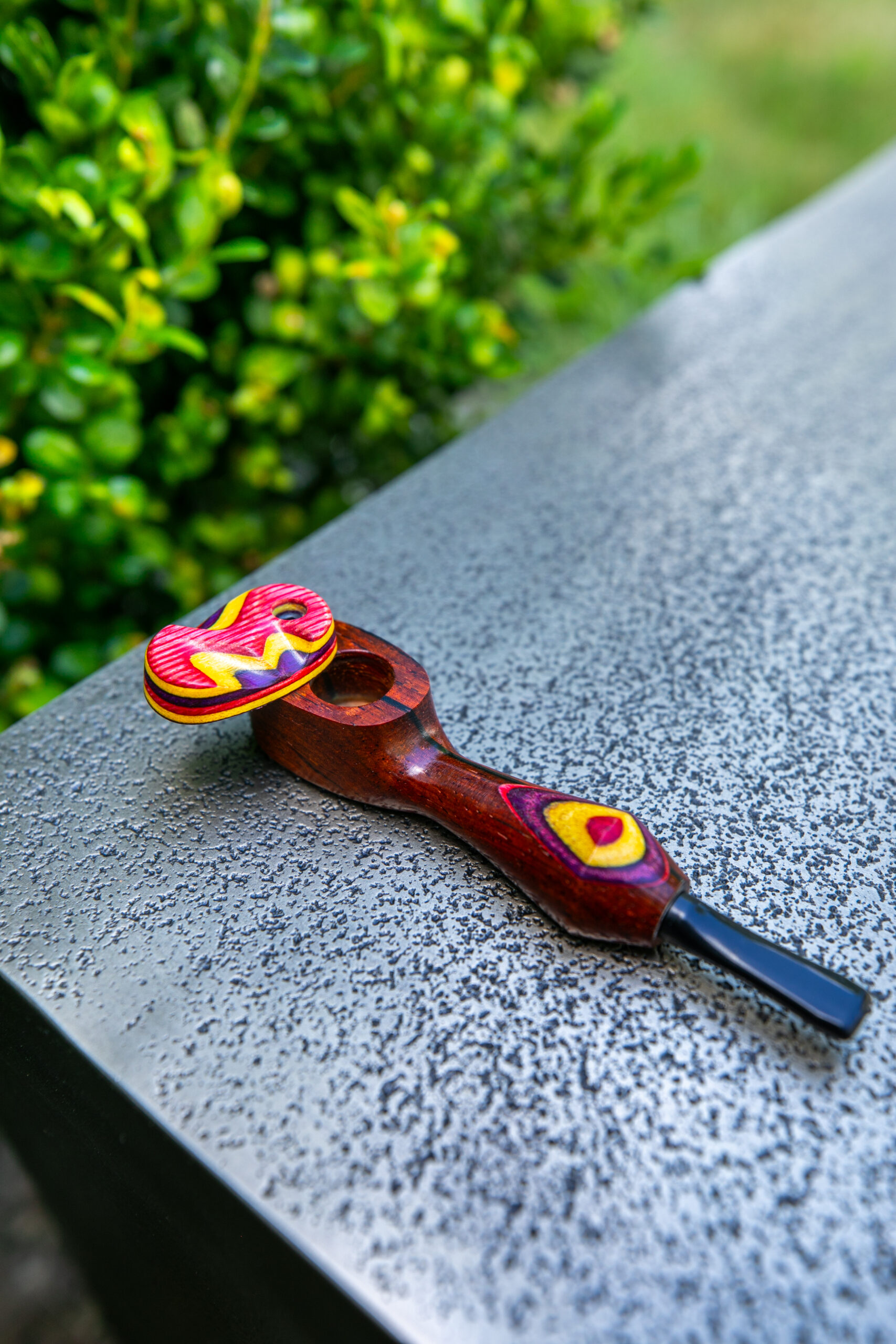 L-53 Diamondwood and/or Rainbow Wood cap and shank inlay grace this intricately carved beauty. 9/16” bowl, 3 3/8” wood stem + 1 1/8”mouthpiece = 4 ½” length.