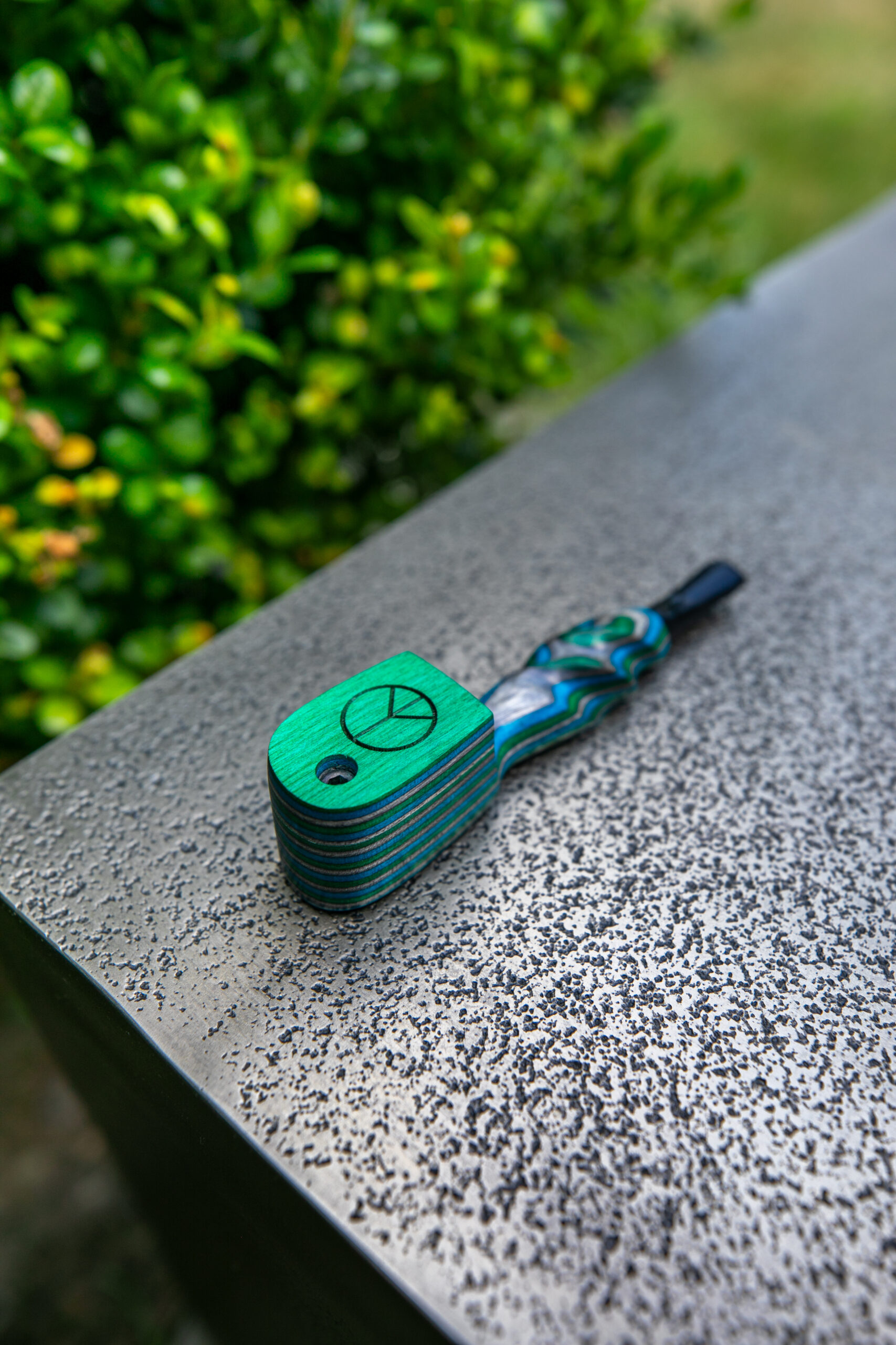 Choose your own cap. A laser-engraved symbol sits atop the cap of this Rainbow Wood pocket pipe. 4 and 5/8 inches long. Carving on the shank exposes different layers of color and creates interesting figure.