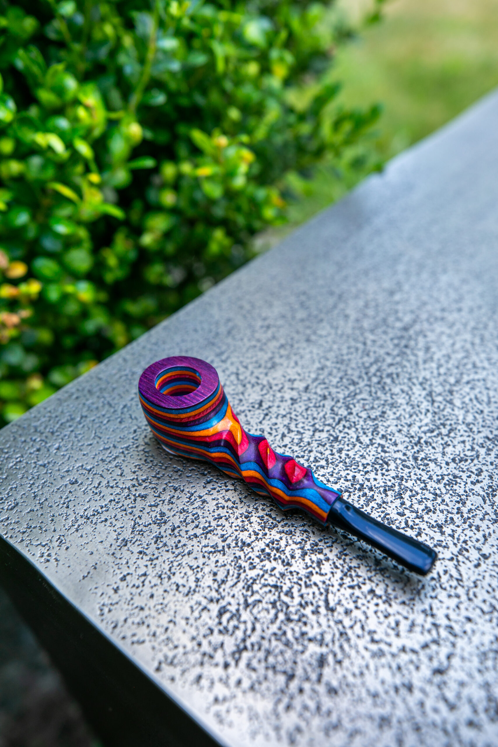 This is a Rainbow Wood calumet with a carved spiral on the shank. Laminated Rainbow Wood is very showy when cut through different layers. 9/16” bowl, 2 ¾” wood shank + 1 1/8” mouthpiece = 3 7/8” length.