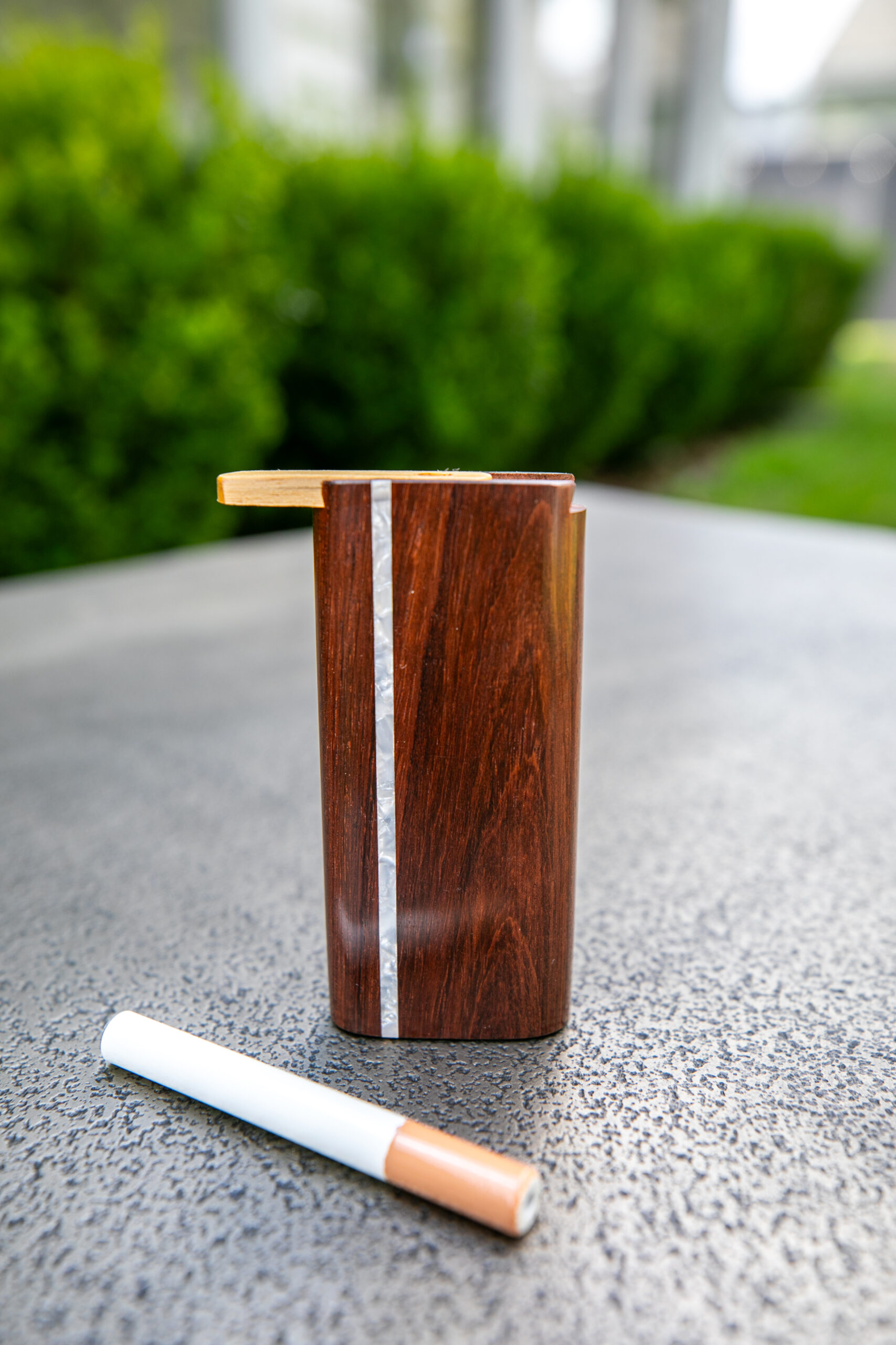 Large honduras wood dugout with pearl inlay and slider top. Large anodized cigarette smoker included.