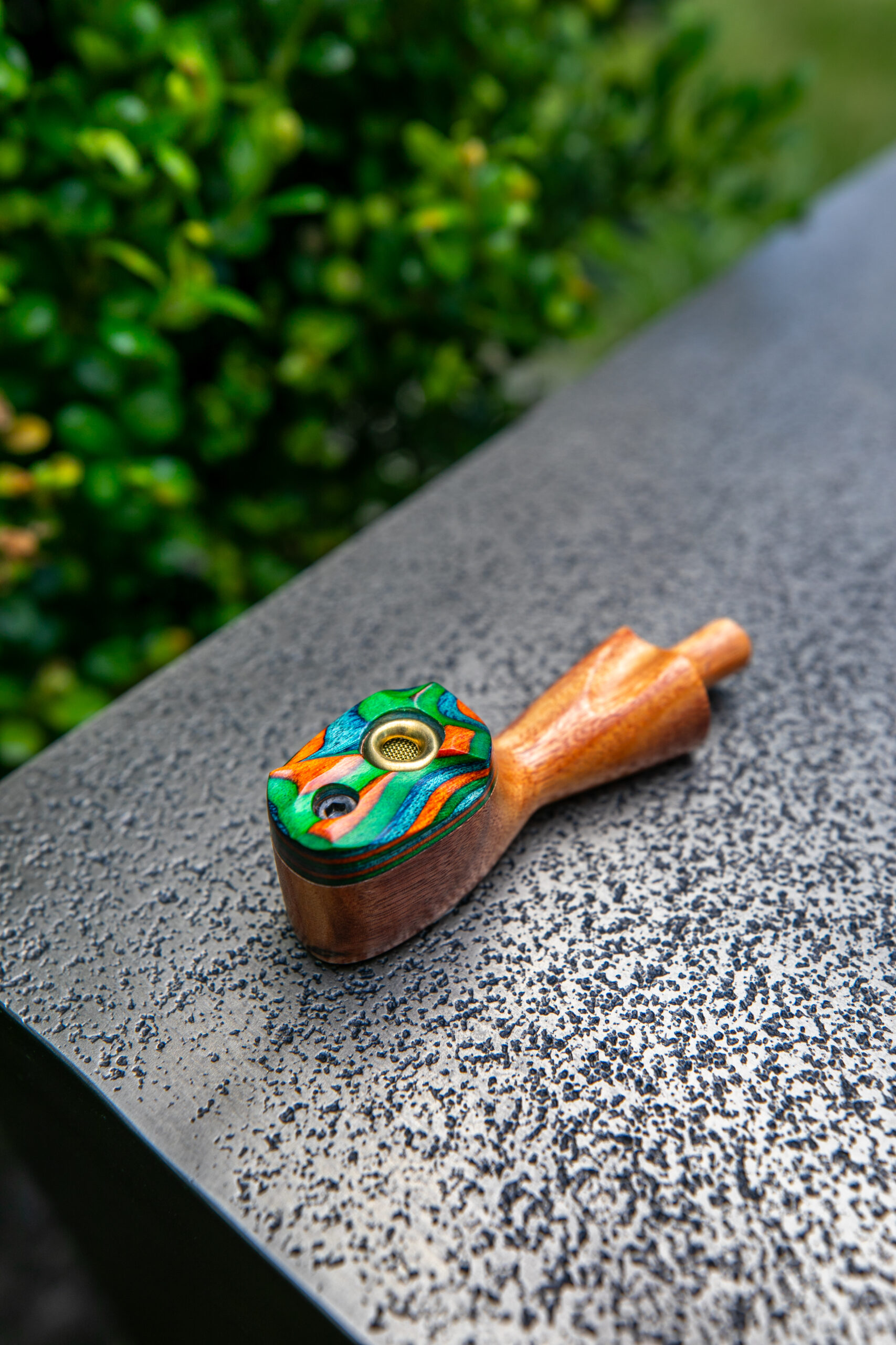 A carved smoke-through cap and exotic wood bottom offer brilliant contrast and convenience in this wood pipe. No smoke escapes when the cap is closed. The next puff is ready in an instant.